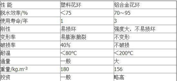 鋁花環(huán)填料主要應(yīng)用于TRT發(fā)電機(jī)組中噴堿塔以及鋼鐵廠高爐煤氣清洗中的脫水器,也可用于化工廠中的填料塔中。在煤氣脫水器中使用后煤氣中的機(jī)械水脫除到7g/Nm3。在鋼鐵廠二文填料脫水器中,與所用塑料花環(huán)相比,金屬花環(huán)填料增加,不易膨脹脆裂。鋁合金金屬花環(huán)填料作為材質(zhì)填料,在脫水性能、使用壽命等方面都比塑料花環(huán)明顯優(yōu)越(性能對(duì)比見(jiàn)表)。