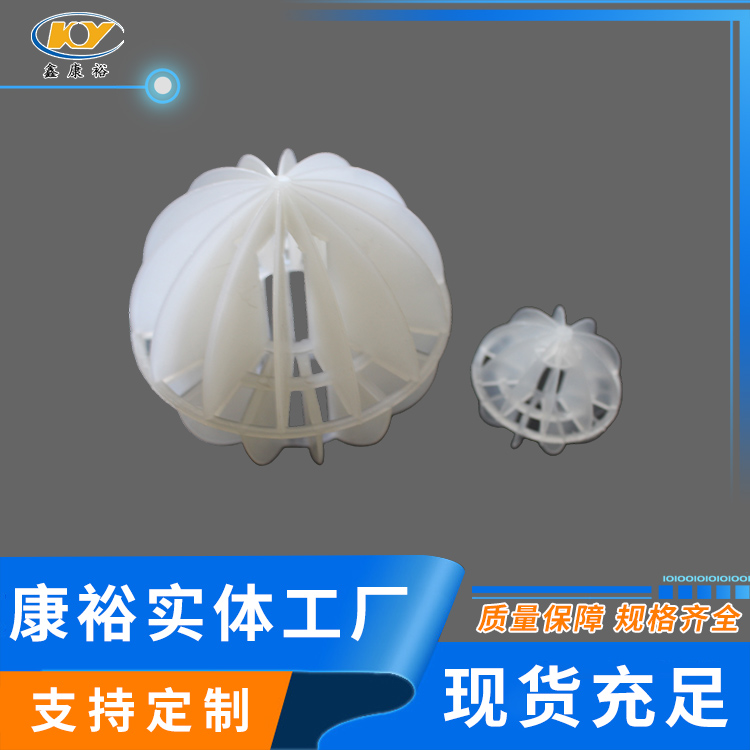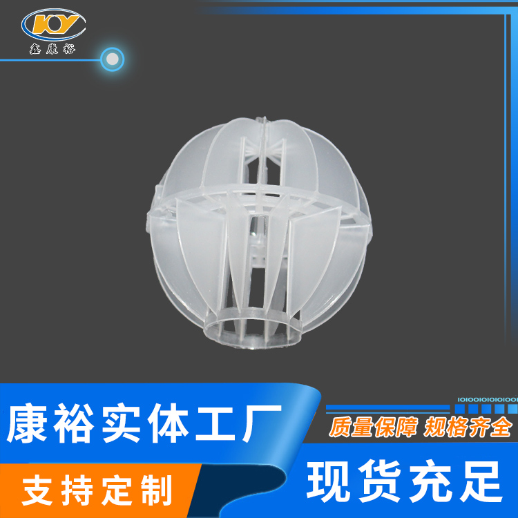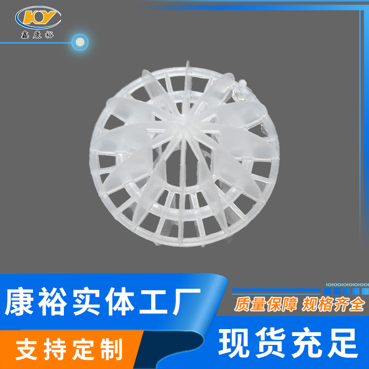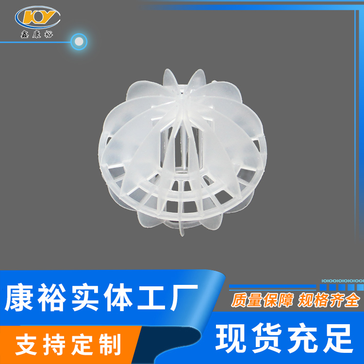塑料多面空心球填料是水處理項(xiàng)目和廢氣處理常用到的一種填料,也是現(xiàn)在環(huán)保裝置項(xiàng)目常見的一種填料,大多采用聚丙烯(PP)塑料制成。多面空心球填料,在球中部沿整個(gè)周長(zhǎng)有一道加固環(huán),環(huán)的上下各有十二片球瓣,上下球瓣互相交錯(cuò),沿中心軸呈放射形布置。多面空心球填料具有表面積大,傳質(zhì)效率高,產(chǎn)品的球瓣與球瓣之間空間大,且重量輕、強(qiáng)度大、安裝方便、葉片多,阻力小,耐高溫,耐腐蝕,性能穩(wěn)定,適用于中間水箱,二氧化碳脫氧塔,接觸反應(yīng)塔等裝置。在全國(guó)電力、化學(xué)、化纖、電子、造紙、化肥生產(chǎn)、河水淡化,環(huán)保、三廢處理等行業(yè)的水處理、脫碳、脫氣、凈化、脫碳酸及油水分離等處理裝置中廣泛使用。