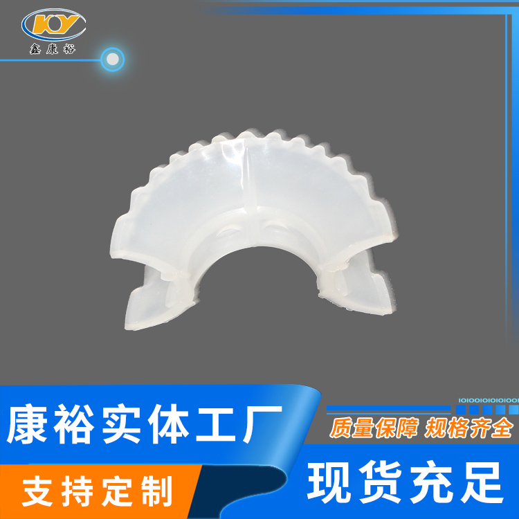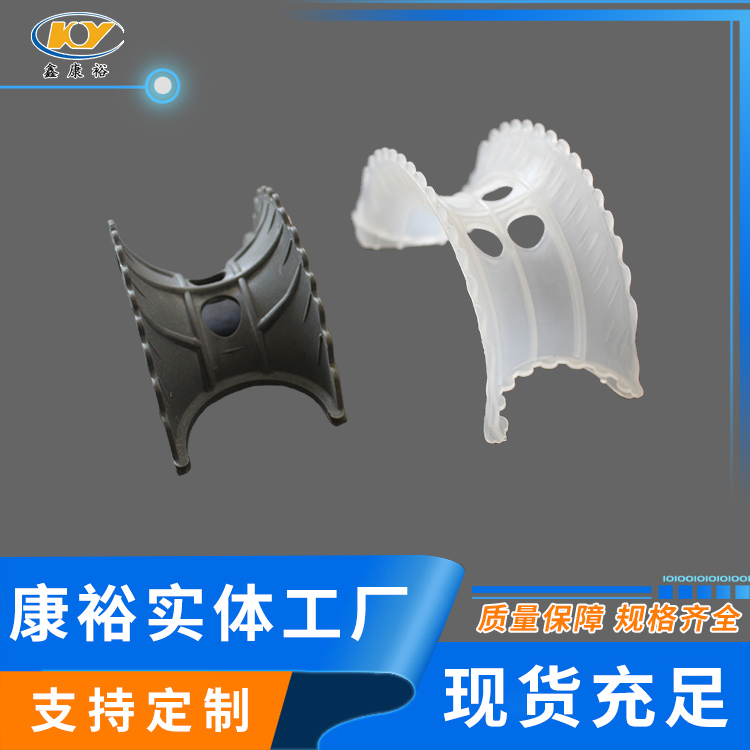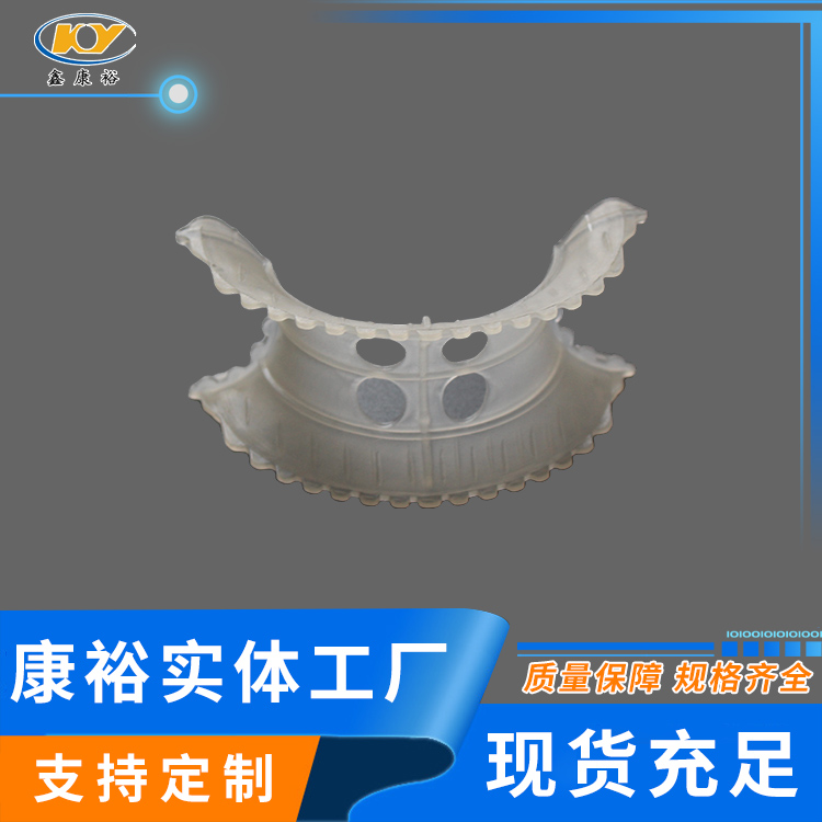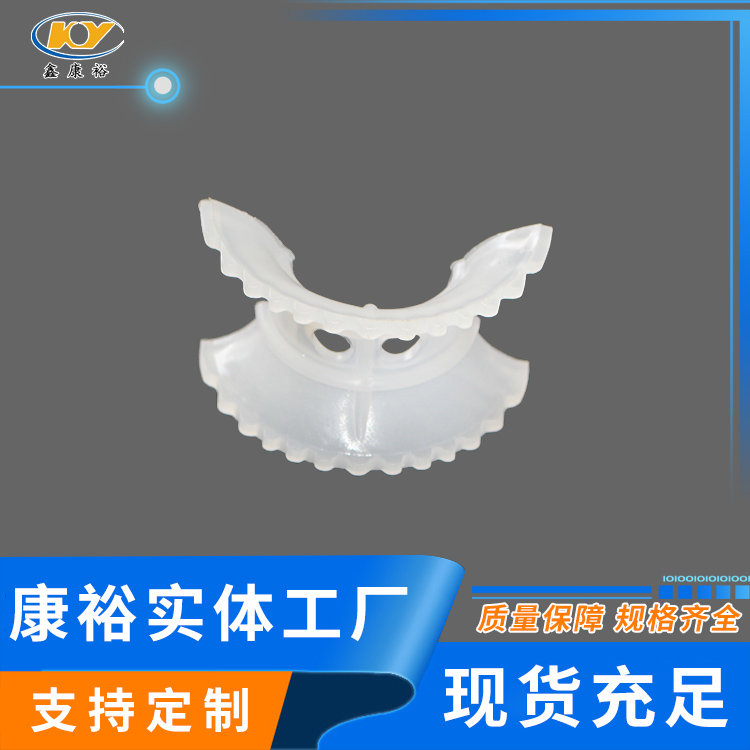 塑料異鞍環(huán)是20世紀(jì)70年代美國Noton公司對(duì)普通矩鞍環(huán)填料作出了改進(jìn),其特點(diǎn)是將扇形弧面改進(jìn)成帶鋸齒邊緣的貝殼狀弧面,并在鞍背上增加了開孔,這樣填料層內(nèi)的通道更加通暢,改善了液體分布性能,降低了氣體通過的阻力,提高了傳質(zhì)性能。塑料異鞍環(huán)鞍形填料類似于馬鞍形狀,這種填料層中主要為弧形的液體通道,填料層內(nèi)的空隙較環(huán)形填料(尤其較拉西環(huán)填料)更加連續(xù)。